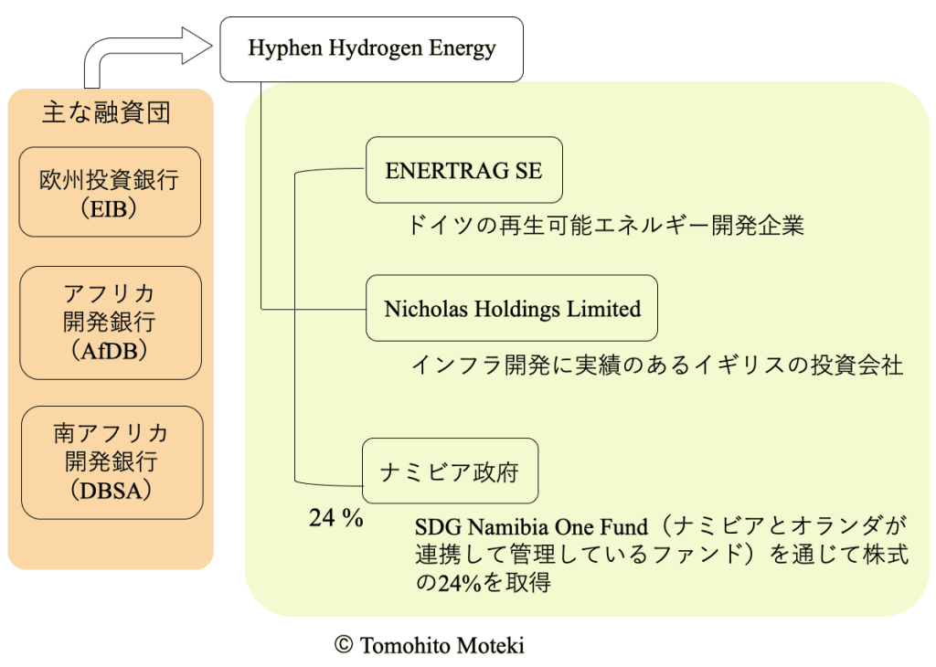 このプロジェクトを実施するために作られた会社である『 Hyphen Hydrogen Energy 』社に出資した企業、このプロジェクトに融資する主な組織を、以下の図にて記載しました。